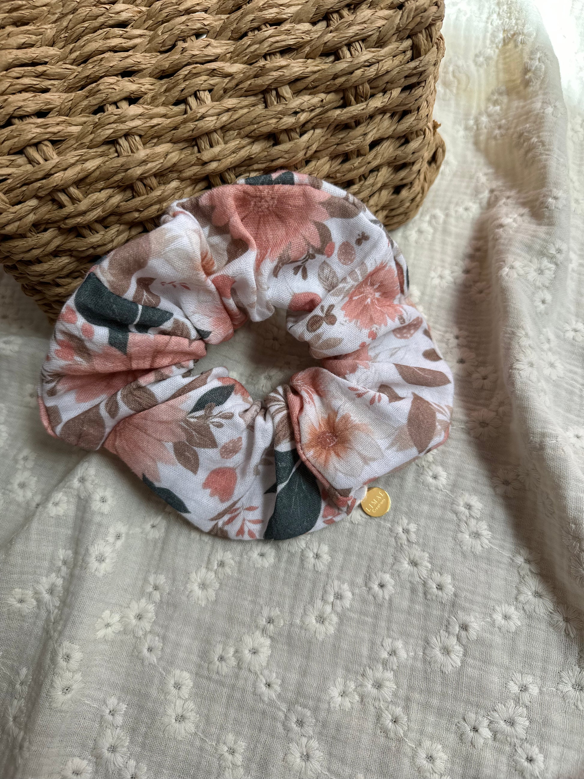 Un chouchou poétique avec le tissu exclusif Limaé imprimé sur de la gaze de coton. Une pampille métallique gravé au nom de Limaé créations