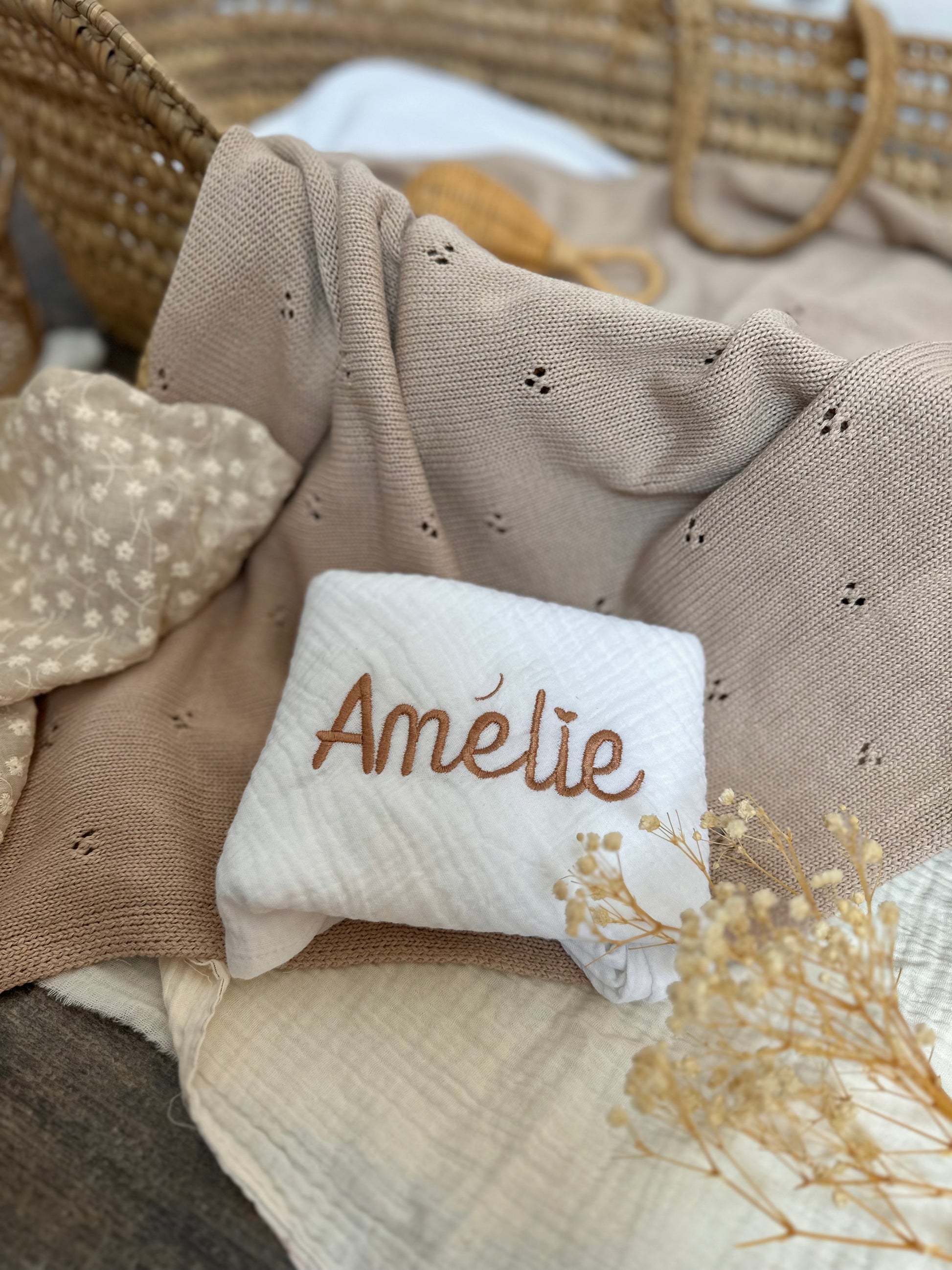 Quoi de plus beau, que d’offrir un lange brodé au doux prénom du nouveau-né.