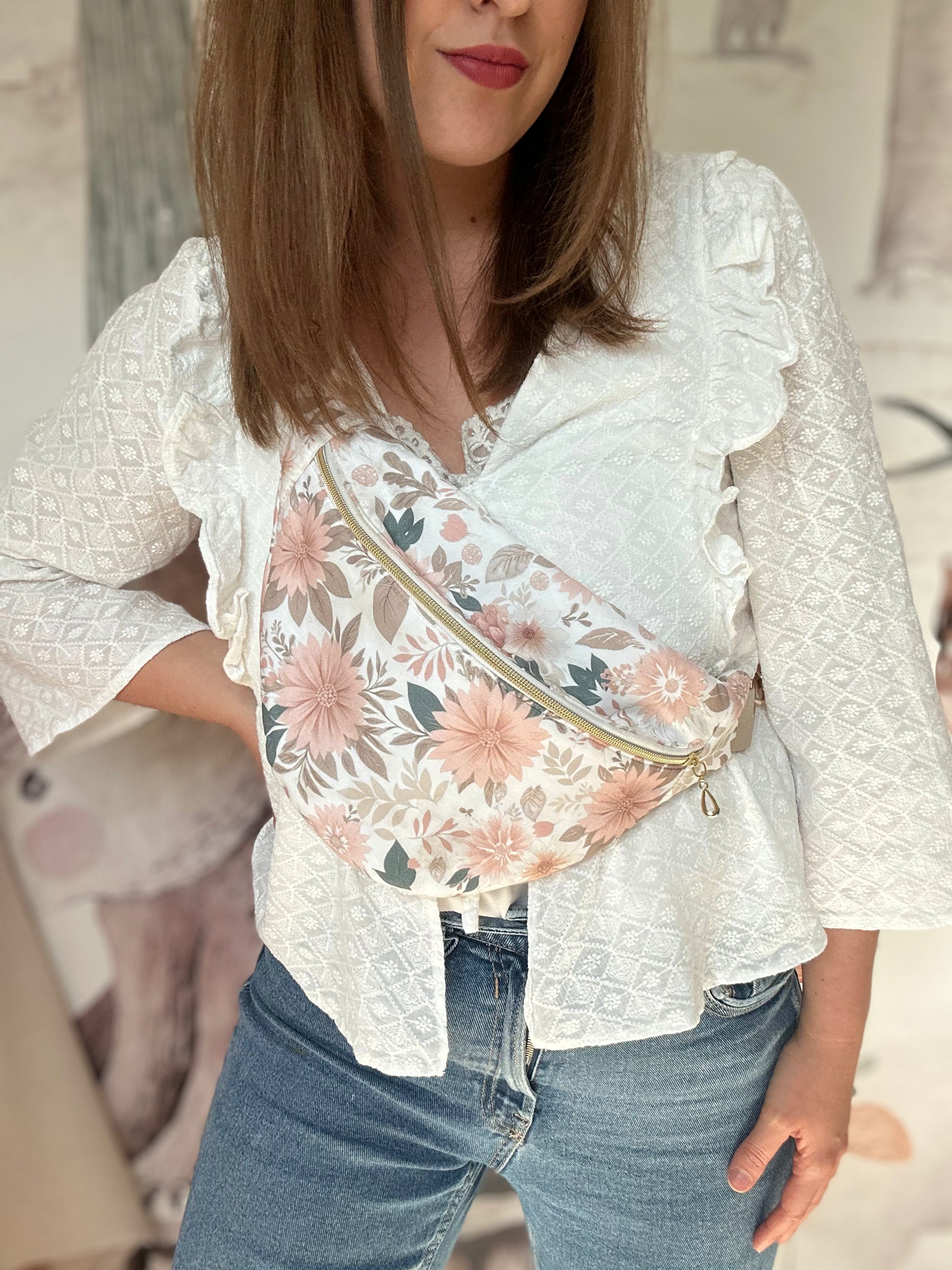 Un motif fleuri aux nuances tendres qui donne vie à une collection délicate et raffinée : un sac banane élégant